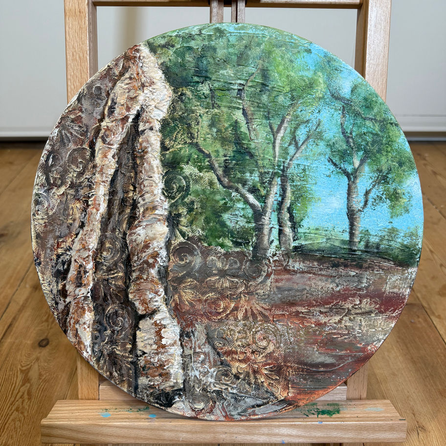 30cm Round. Mixed media oil painting on canvas, ready to hang.